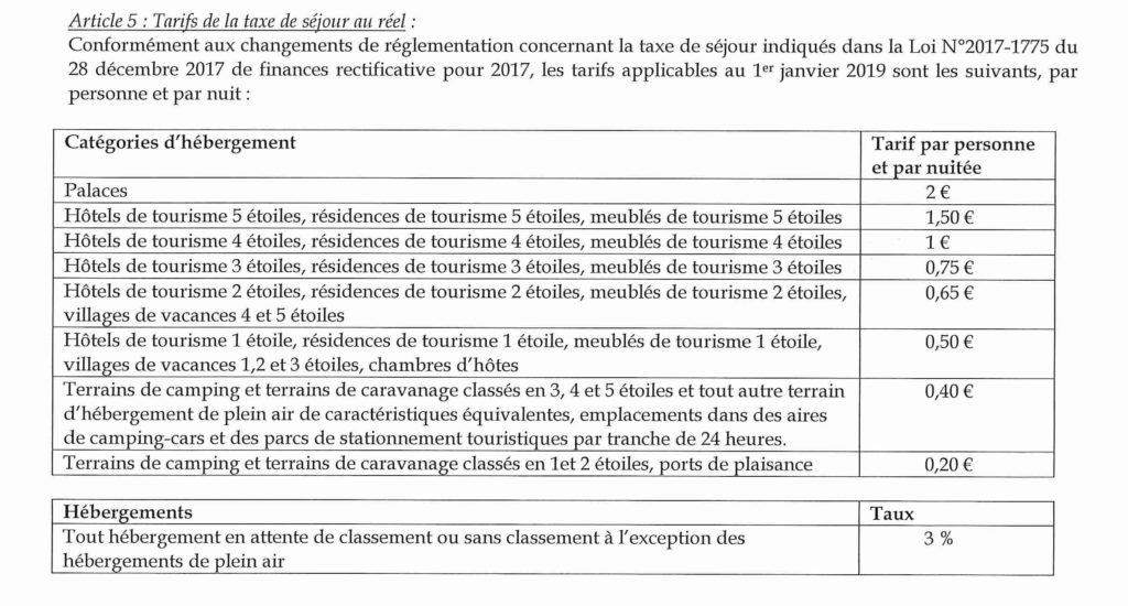 Taxe de séjour – modifications tarifs à compter de 2019