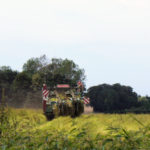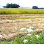 Afin que le rouissage (rouissage= sorte de pourrissement de la tige) puisse s’opérer, on laisse ces bottes à plat sur le sol. Cette opération peut durer 3 à 8 semaines selon les prévisions météorologiques. Pour cela, il faut la pluie.